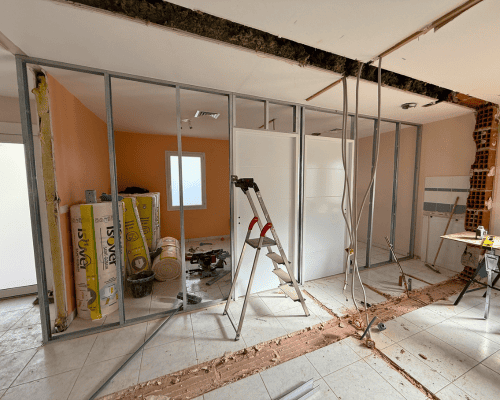 Reconfiguration des espaces, création de cloisons en placo pour séparer salle d’attente, accueil et salles de soin